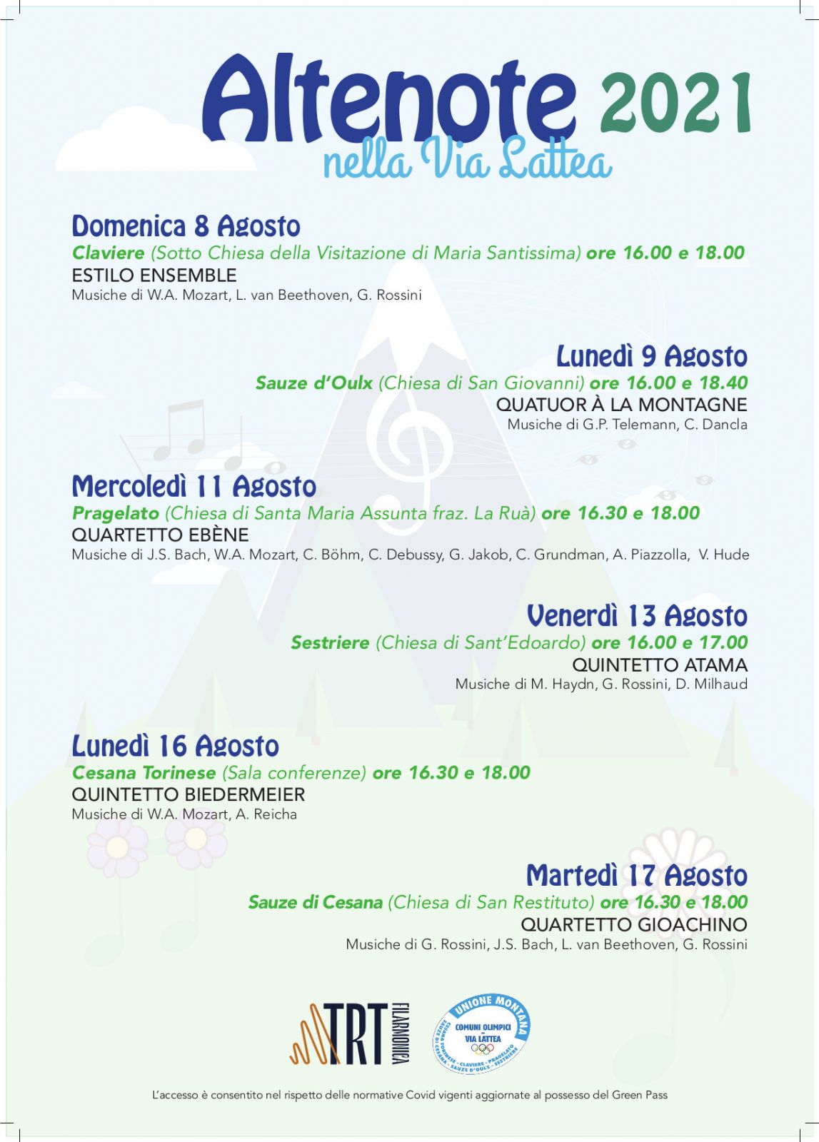 Si informano i gentili ospiti che, in ottemperanza alle disposizioni nazionali, per assistere ai concerti gratuiti inseriti nel programma Altenote nella Via Lattea 2021 si dovrà necessariamente effettuare anzitempo la prenotazione personale presso gli uffici del turismo territoriali.