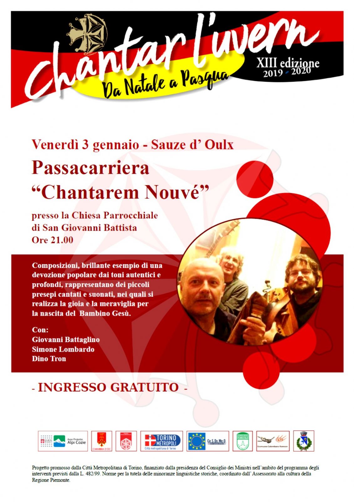 Per la rassegna CHANTAR L’UVERN - PASSACARIERA - “Chantarem Nouvé. Tra i vari percorsi nei quali si è declinata la musica popolare delle terre d’OC, particolare importanza assumono i “Nouvés” o “Nadalets”. Il termine indica il Natale e queste composizioni, brillante esempio di una devozione popolare dai toni autentici e profondi, rappresentano dei piccoli presepi cantati e suonati, nei quali si realizza la gioia e la meraviglia per la nascita del Bambino Gesù. Ore 21.00 Chiesa Parrocchiale di San Giovanni Battista. Ingresso gratuito
