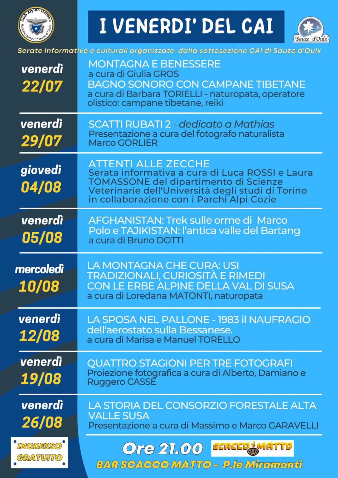 I VENERDI’ DEL CAI - Serate informative e culturali organizzate dalla sottosezione CAI di Sauze d’Oulx LA MONTAGNA CHE CURA: USI TRADIZIONALI, CURIOSITÀ E RIMEDI CON LE ERBE ALPINE DELLA VAL DI SUSA. Presentazione a cura di Loredana MATONTI, naturopata - Ore 21.00 – c/o Bar Scacco Matto – P.le Miramonti