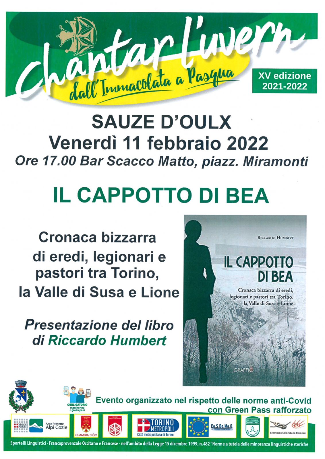 Venerdì 11 febbraio alle ore 17.00, al Bar Scacco Matto piazzale Miramonti a Sauze d’ Oulx, Riccardo Humbert ci presenterà il suo ultimo libro "Il cappotto di Bea" edito Il Graffio. Questa storia misteriosa scritta da Riccardo, abitante del grazioso borgo di Exilles, ci condurrà tra Torino e Lione e in particolare attraverso la Valle di Susa.
