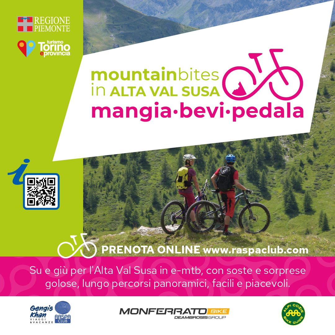 Su e giù per l’Alta Val Susa in e-mtb, con soste e sorprese golose, su percorsi panoramici, facili e piacevoli adatti a tutte le tipologie di ciclisti, compresi neofiti, giovanissimi e non più giovani. L’organizzazione tecnica è di Gengis Khan Viaggi - Raspa Club mentre la selezione degli itinerari e l’accompagnamento sono curati da Alpi Cozie Bike Guide. Prenotazioni: www.raspaclub.com
