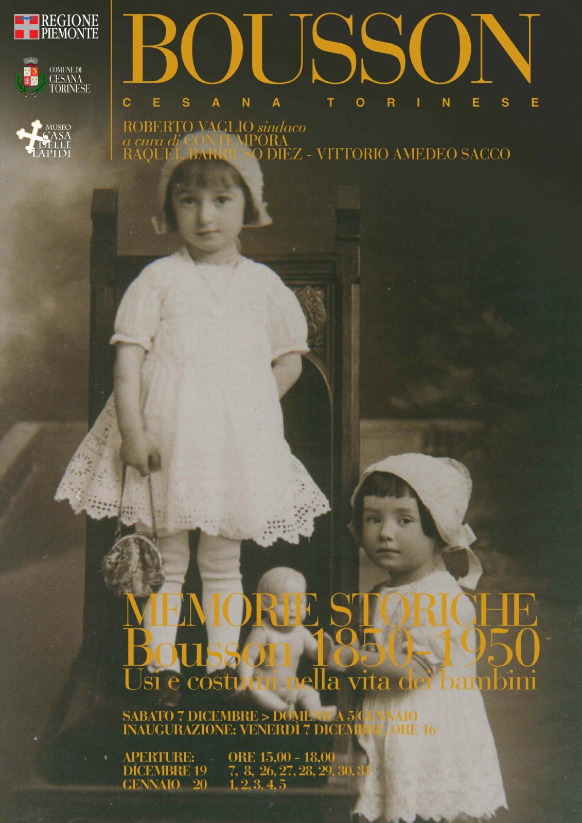 I bambini di Bousson, di ieri e di oggi, si raccontano, attraverso il percorso dell’allestimento della mostra che propone vari momenti della loro vita quotidiana: la nascita, i sacramenti, i giochi invernali e quelli estivi, le favole, le cantilene, le filastrocche e gli epiteti, le feste, gli abiti e infine la scuola, in esposizione anche documenti dell’archivio storico di Bousson.