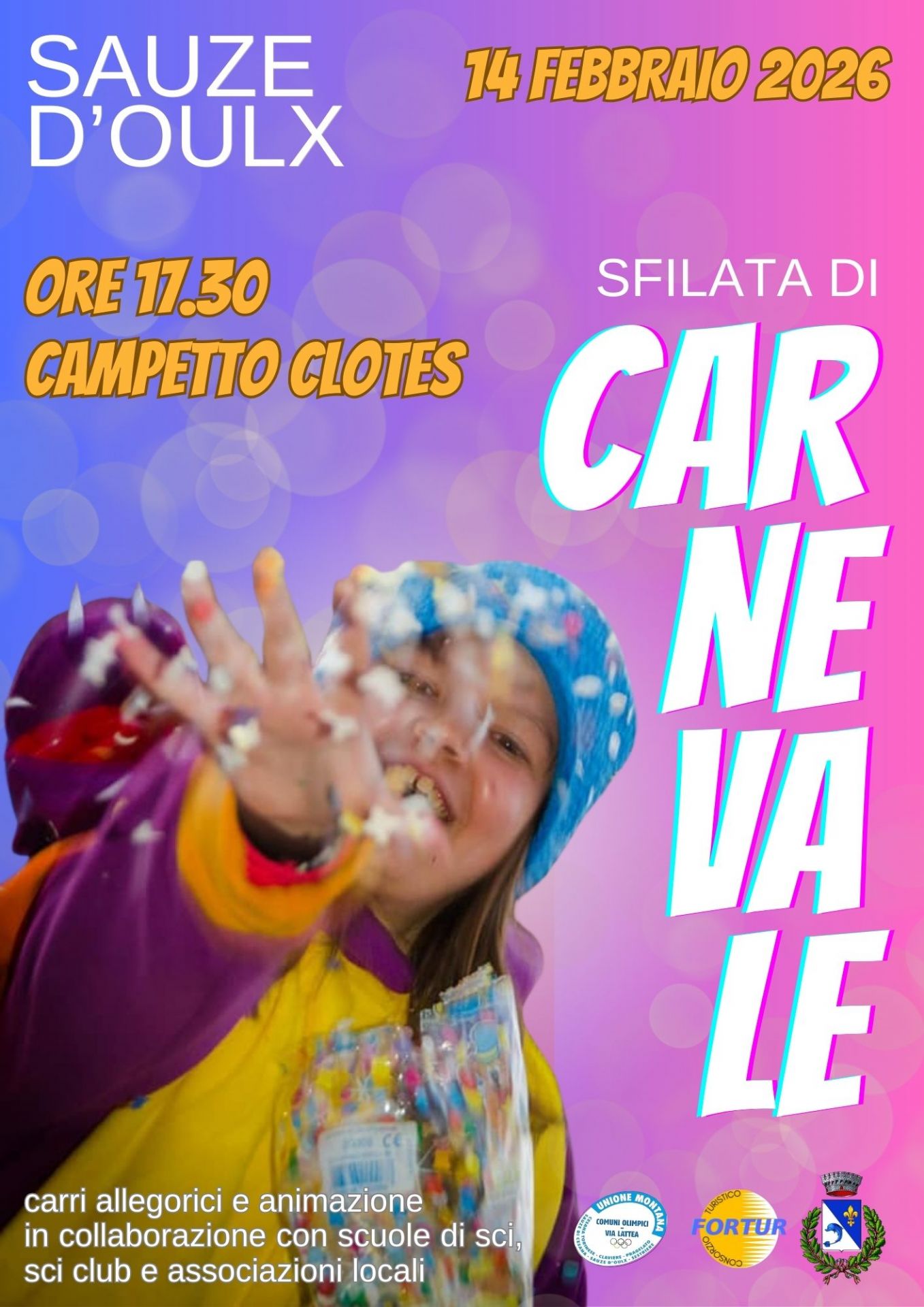 Dopo il ritrovo alle ore 17,30 al Campetto Clotes, partirà la variopinta sfilata che si concluderà in Piazza III Reggimento Alpini dove verrà bruciato simbolicamente il Carnevale e dove, con animazione musicale, la Pubblica Assistenza di Sauze d’Oulx distribuirà bevande calde e bugie.