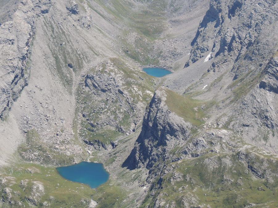 Poco prima della bergeria sul lato destro della sterrata si trova una fontana (unico punto acqua del percorso); poco oltre paletti bianco/rossi indicano il sentiero che prende quota rapidamente fino al costolone che scende dalla Cima i Tre Truc. Lo si risale per tracce di sentiero e pietraia con numerose e ripide svolte fino alla cresta che scende dalla punta ormai a breve distanza. Risalire, seguendo il sentiero, il filo di cresta che presenta alcuni tratti su pietraia in cui occorre prestare attenzione. Giunti sotto il torrione sommitale il percorso si fa decisamente più ripido passando in mezzo a grossi blocchi e paretine che si superano agevolmente seguendo i bolli rossi e bianchi (attenzione in caso di nebbia, percorso non tanto intuitivo); si raggiunge una spianata sotto la punta, si evita sulla sinistra una crestina rocciosa e ci si porta alla base del salto finale sotto la croce. Lo si aggira sulla destra e con un breve ma esposto passaggio si tocca la punta.