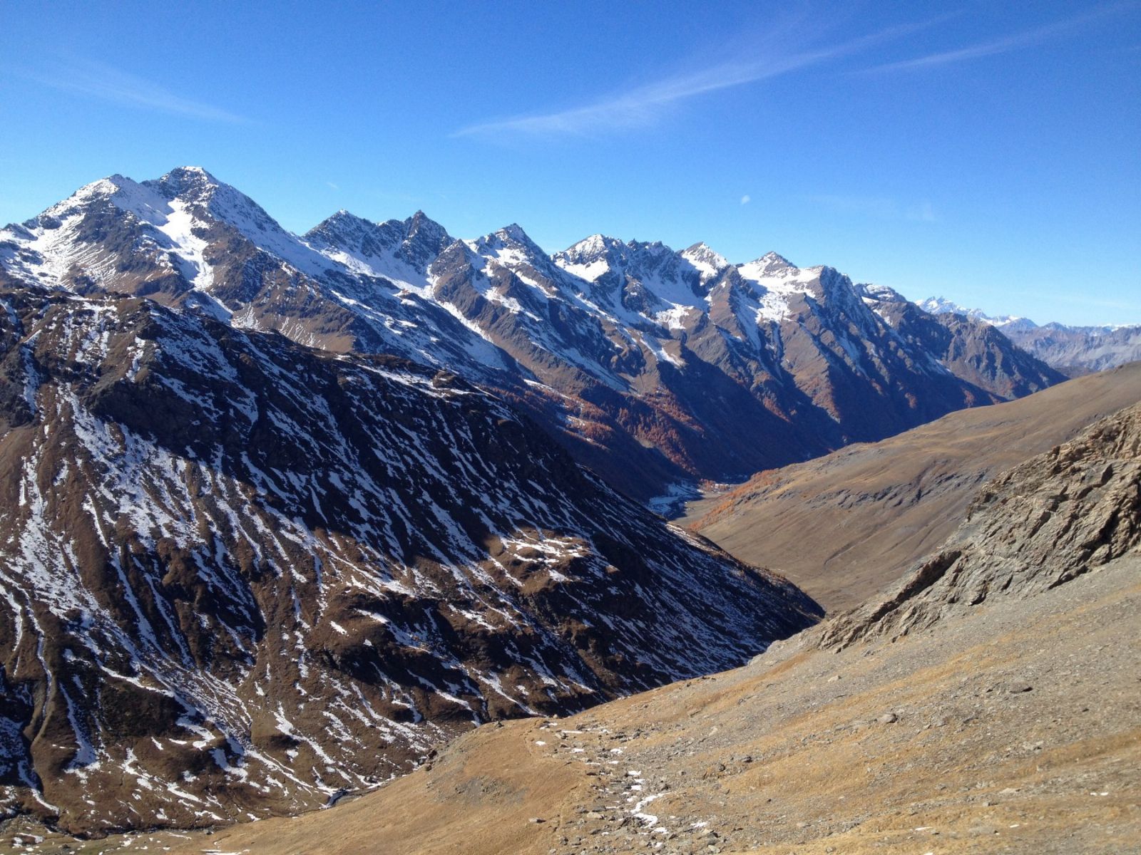 Di qui il sentiero è sempre più o meno evidente e con poco sviluppo sale rapidamente in diagonale al colle (2780m), da cui si ha un'ottima vista sulle valli Argentera e Germanasca.