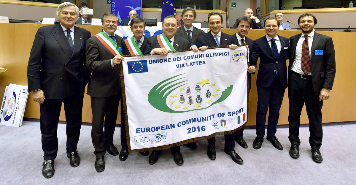Bruxelles - Nel pomeriggio di mercoledì 18 novembre il Parlamento Europeo ha consegnato la bandiera di Comunità Europea dello Sport ai sei comuni della dell'Unione Montana Comuni Olimpici Via Lattea, ovvero, Cesana Torinese, Claviere, Pragelato, Sauze di Cesana, Sauze d'Oulx e Sestriere.