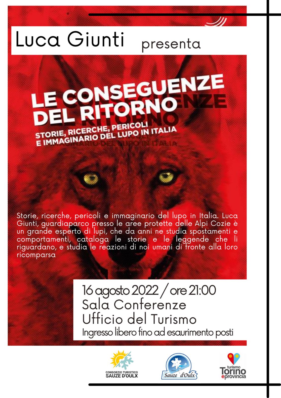 Storie, ricerche, pericoli e immaginario del lupo in Italia. Luca Giunti, guardiaparco presso le aree protette delle Alpi Cozie è un grande esperto di lupi, che da anni ne studia spostamenti e comportamenti, cataloga le storie e le leggende che li riguardano, e studia le reazioni di noi umani di fronte alla loro ricomparsa. Ore 21.00 - Sala Conferenze Ufficio del Turismo – V.le Genevris, 7