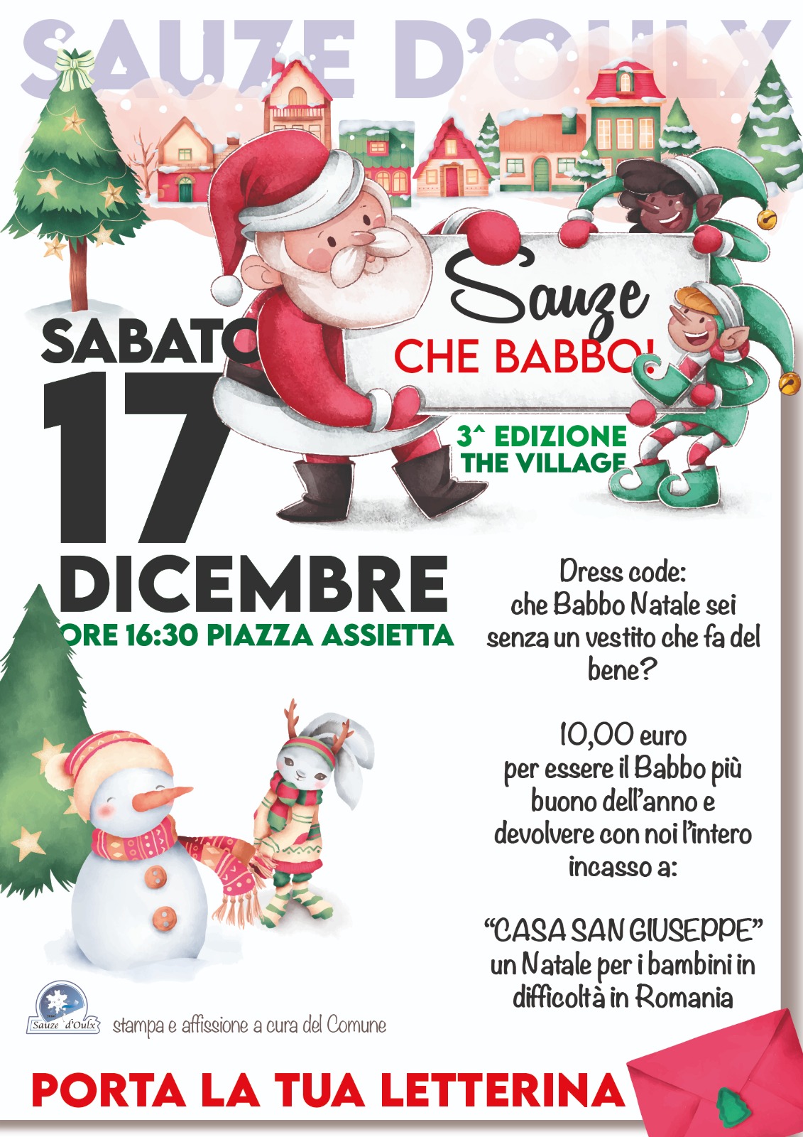 Sabato 17 dicembre torna la terza edizione di "Sauze che babbo!", quest'anno però in versione Villaggio di Natale. Il dress code é quello da Babbo Natale, il cui costume é acquistabile a 10,00€, i quali saranno devoluti a "Casa San Giuseppe", per regalare un felice Natale ai bambini in difficoltà in Romania. Ritrovo in Piazza Assietta alle ore 16:30