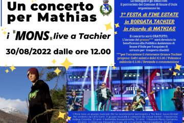 1° festa di fine estate in ricordo di Mathias con il gruppo musicale i MONS. L'incasso del pranzo*** sarà devoluto in beneficenza alla Pubblica Assistenza di Sauze d'Oulx per l'acquisto di...